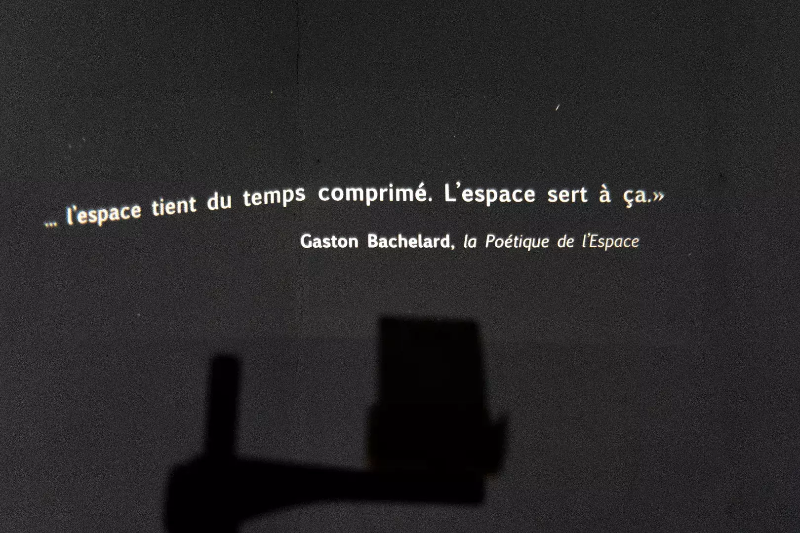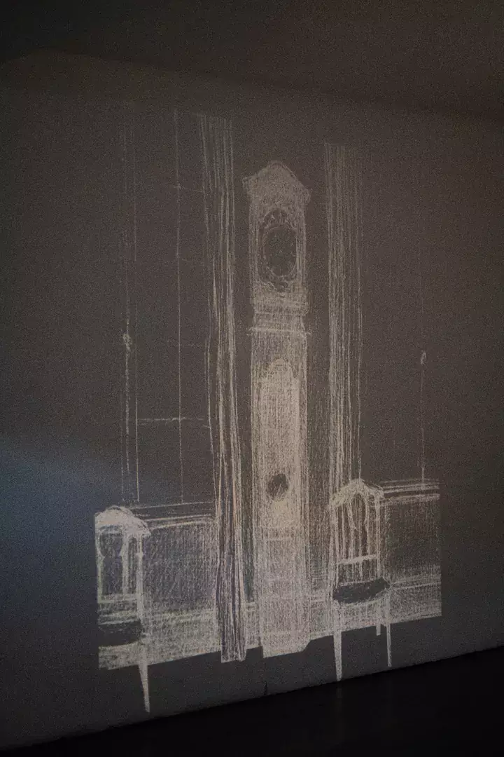 La dernière salle invite à faire l’expérience du « ici et maintenant ». Elle reste pourtant chargée d’une tension. Comment revenir au lieu où nous sommes, en étant encore habités par la mémoire des pièces que l’on a traversées ? C’est cette question de la mémoire d’un lieu et de son empreinte qui est le fil directeur de l’habillage sonore réalisé par Germain Calsou.