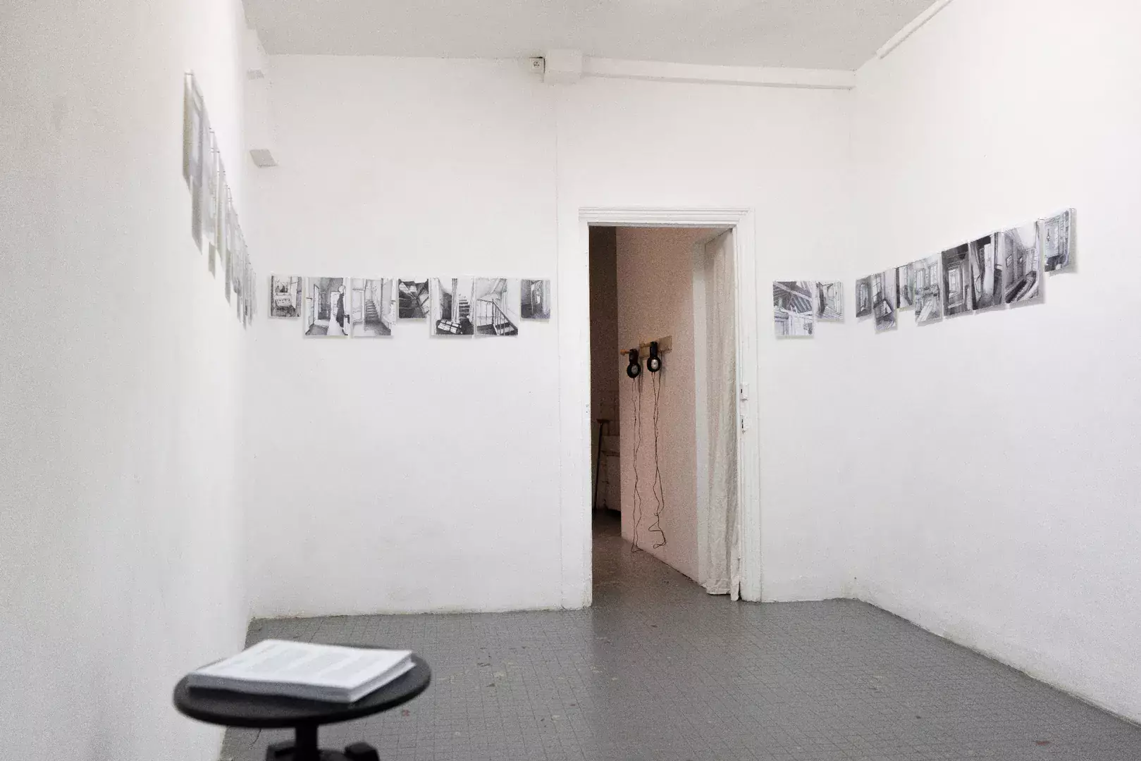 Dans la première pièce, une série de dessins commencée en 2022 qui s’intitule « Théâtre du décor ». Travail du stylo et du temps, les dessins ici présentés sont une réactualisation émotionnelle du « ça a été ».