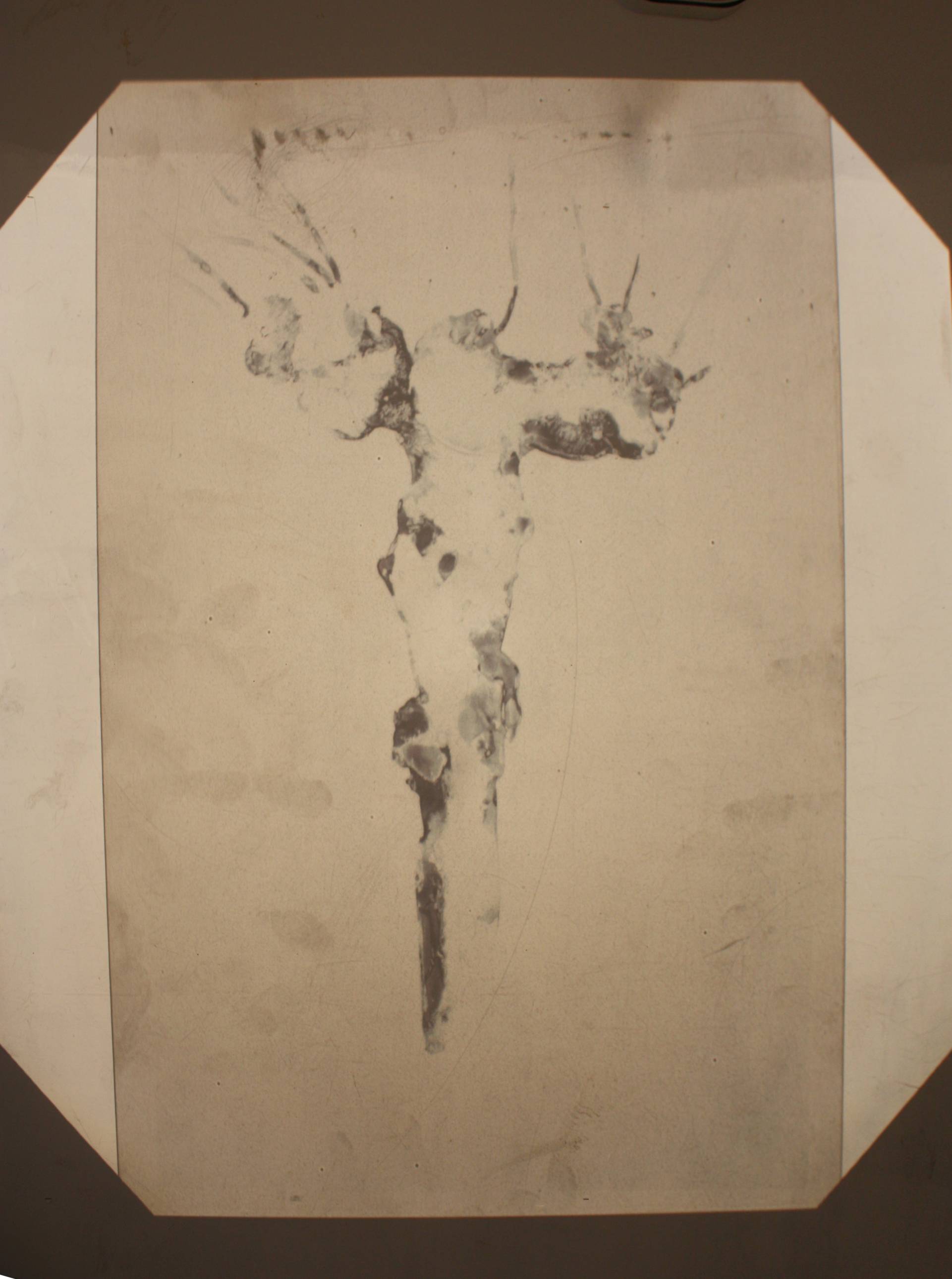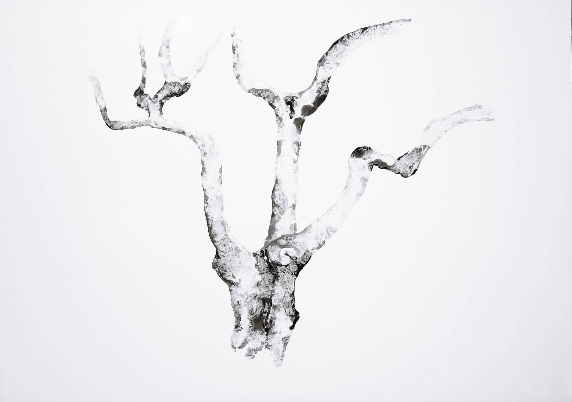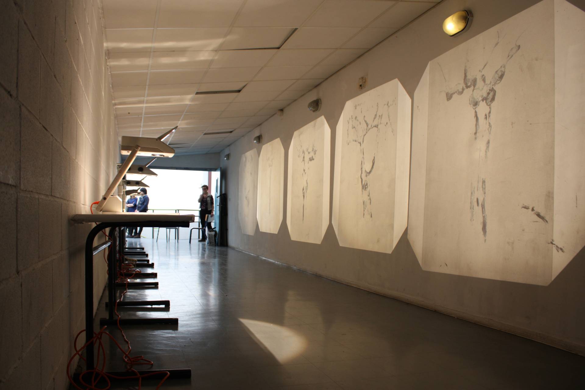 L’installation En chemin a pour point de départ la série Portraits d’arbre. Entre représentation et impression, carnets de nature, visions naturalistes et planches anatomiques, formes et volumes apparaissent en fonction des traces laissées par les retraits d’encre et des zones où le dessin se dilue dans le blanc de la feuille laissant au regard le soin de compléter la forme.