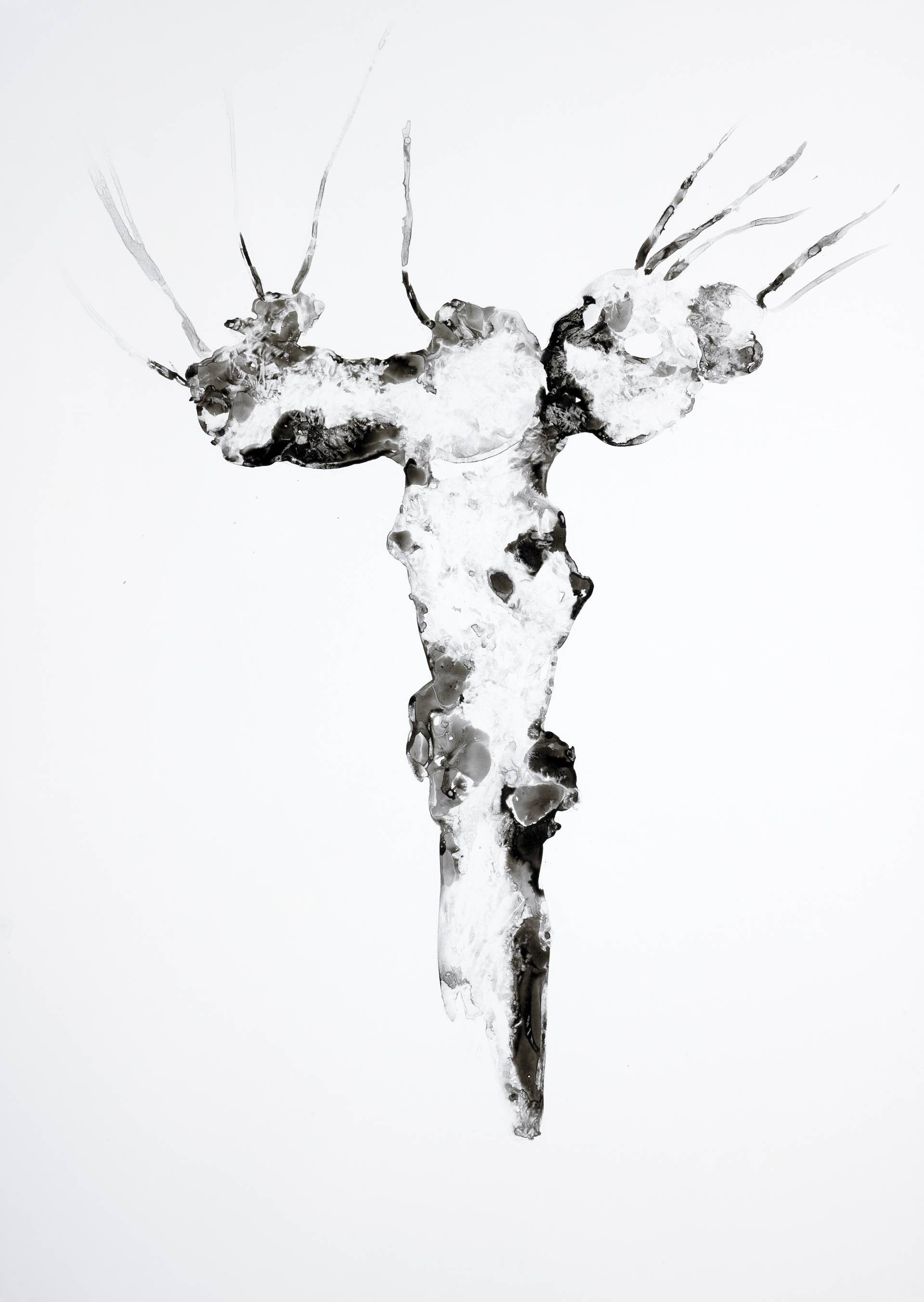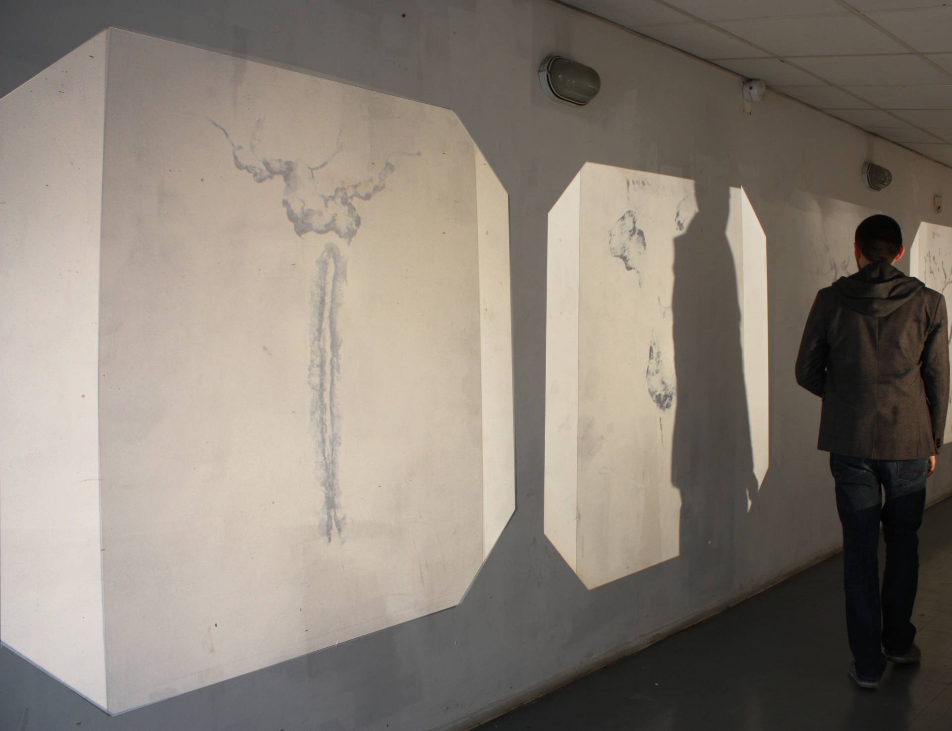 Dans cette installation de 6 rétroprojecteurs, c’est la lumière qui impose la naissance de la forme comme sa mort, entre apparition et disparition. Il ne reste des dessins à l’encre que le motif, l’essence même de la forme meurtrie.