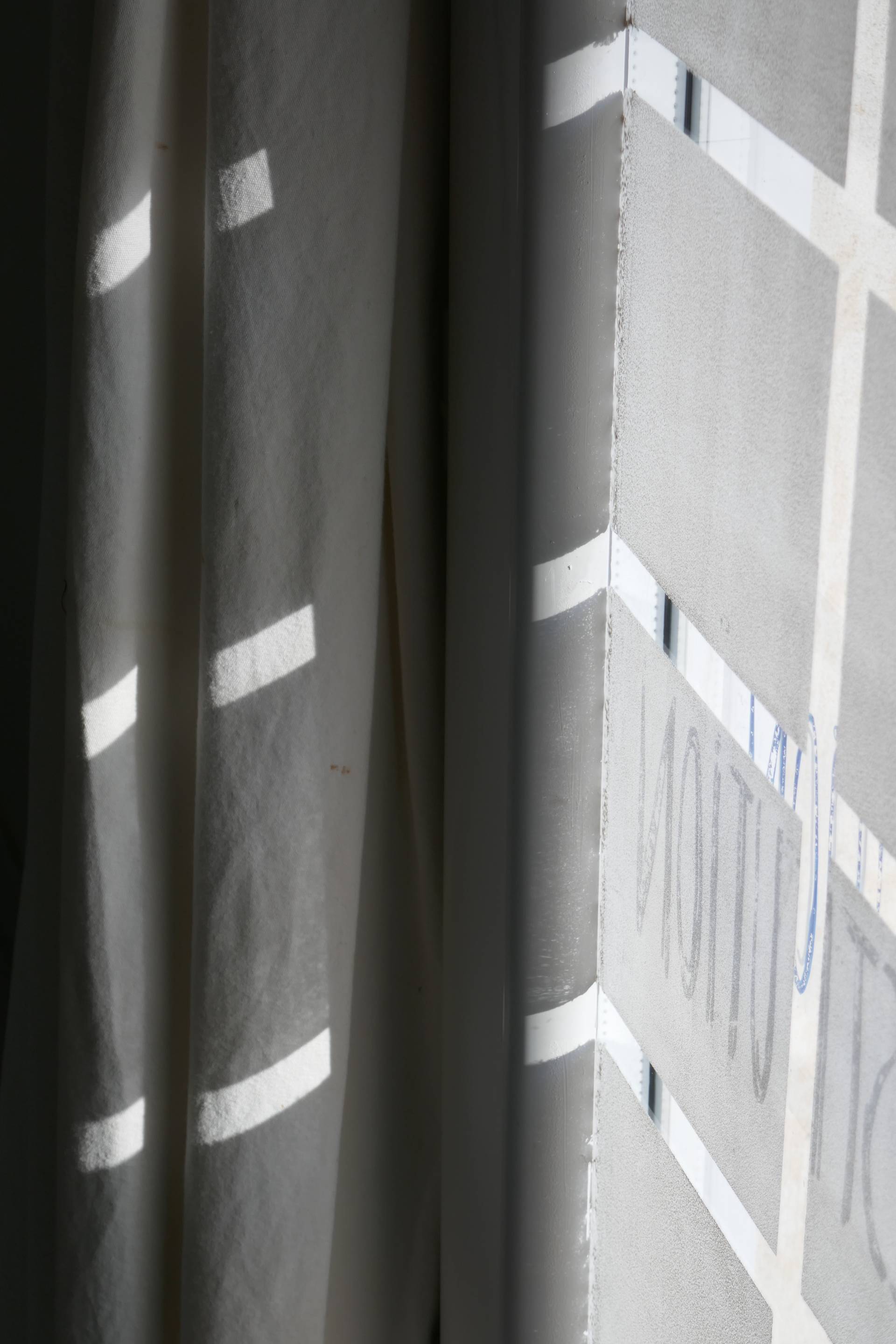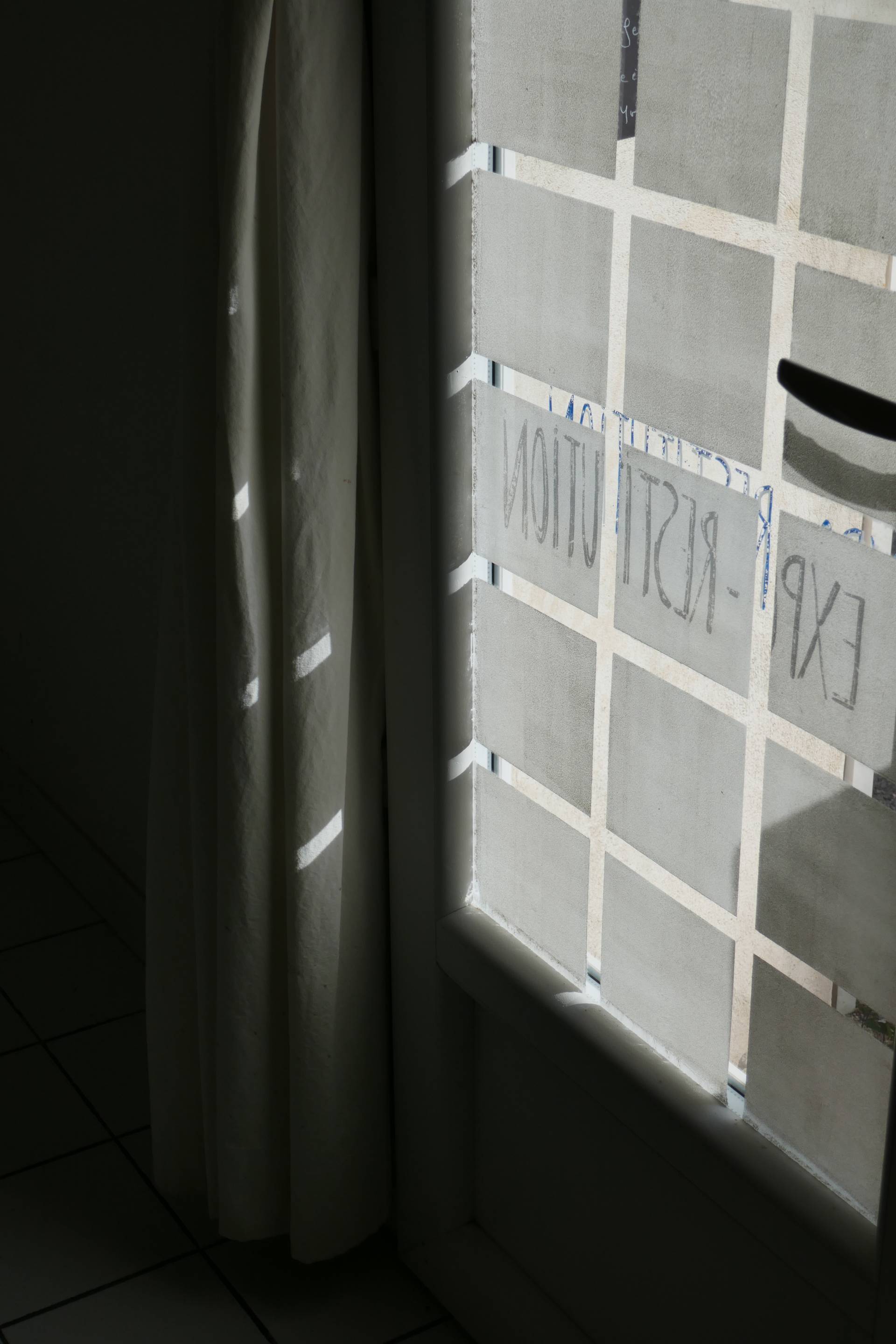 Oeuvre in situ, dessin éphémère sur vitres emoudrées au blanc d’Espagne