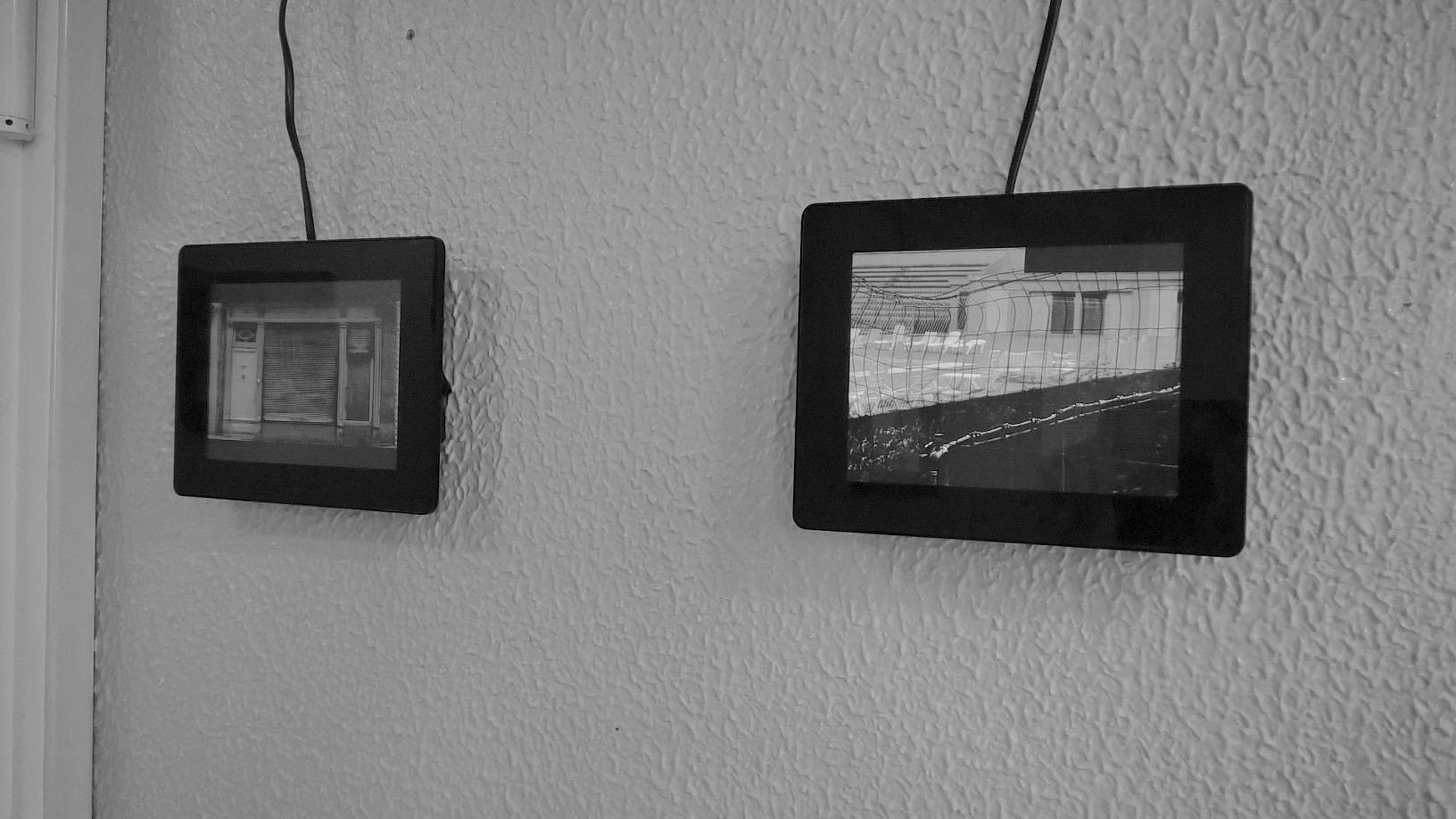 Installation in situ, accrochage mural de photographies, diaporamas sur écrans, vidéo (La Fenêtre) et montage sonore